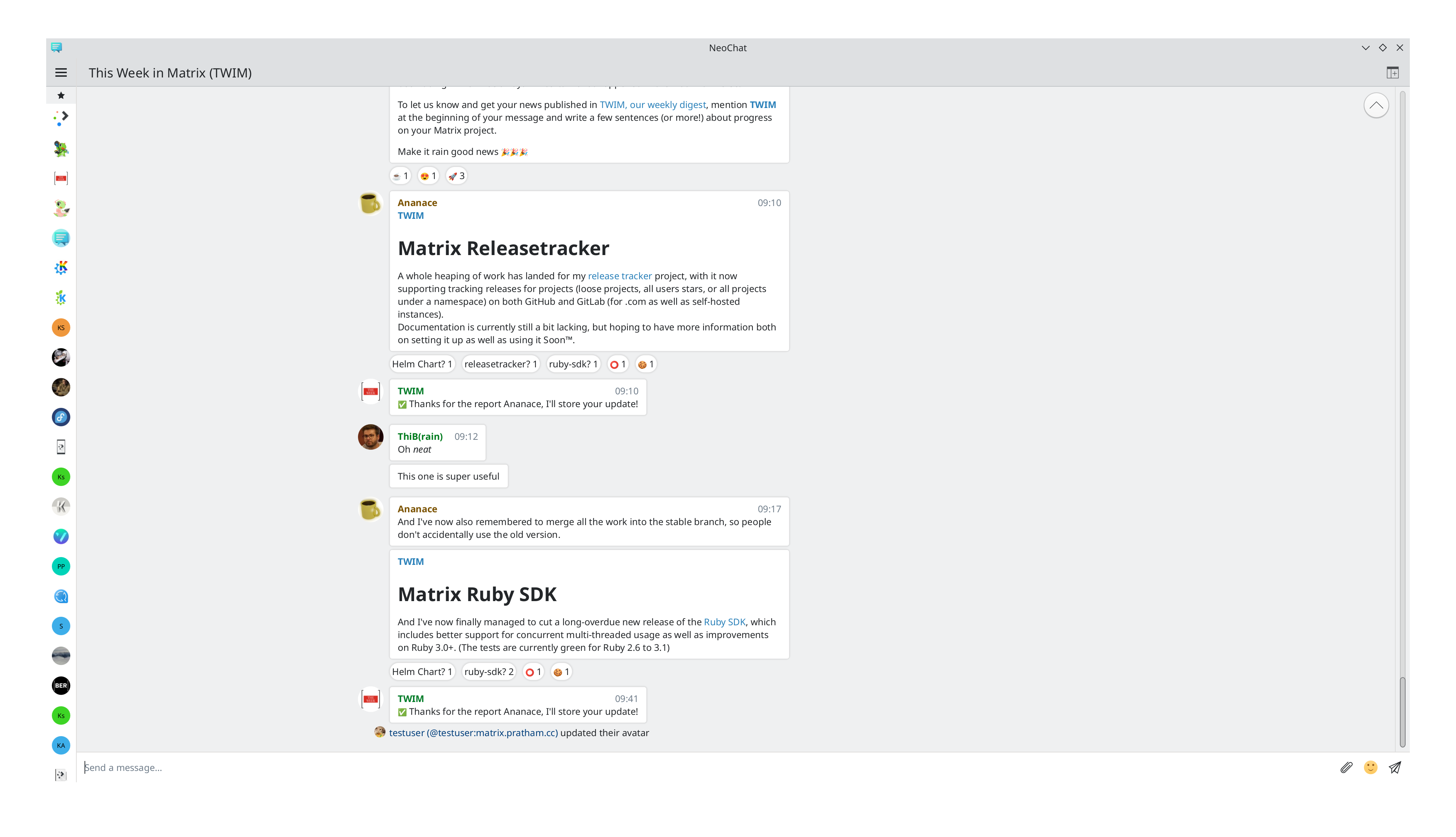 - We're also moving forward on the E2EE support, with NeoChat now allowing a user to send an encrypted message into a matrix room - provided libQuotient supports it π