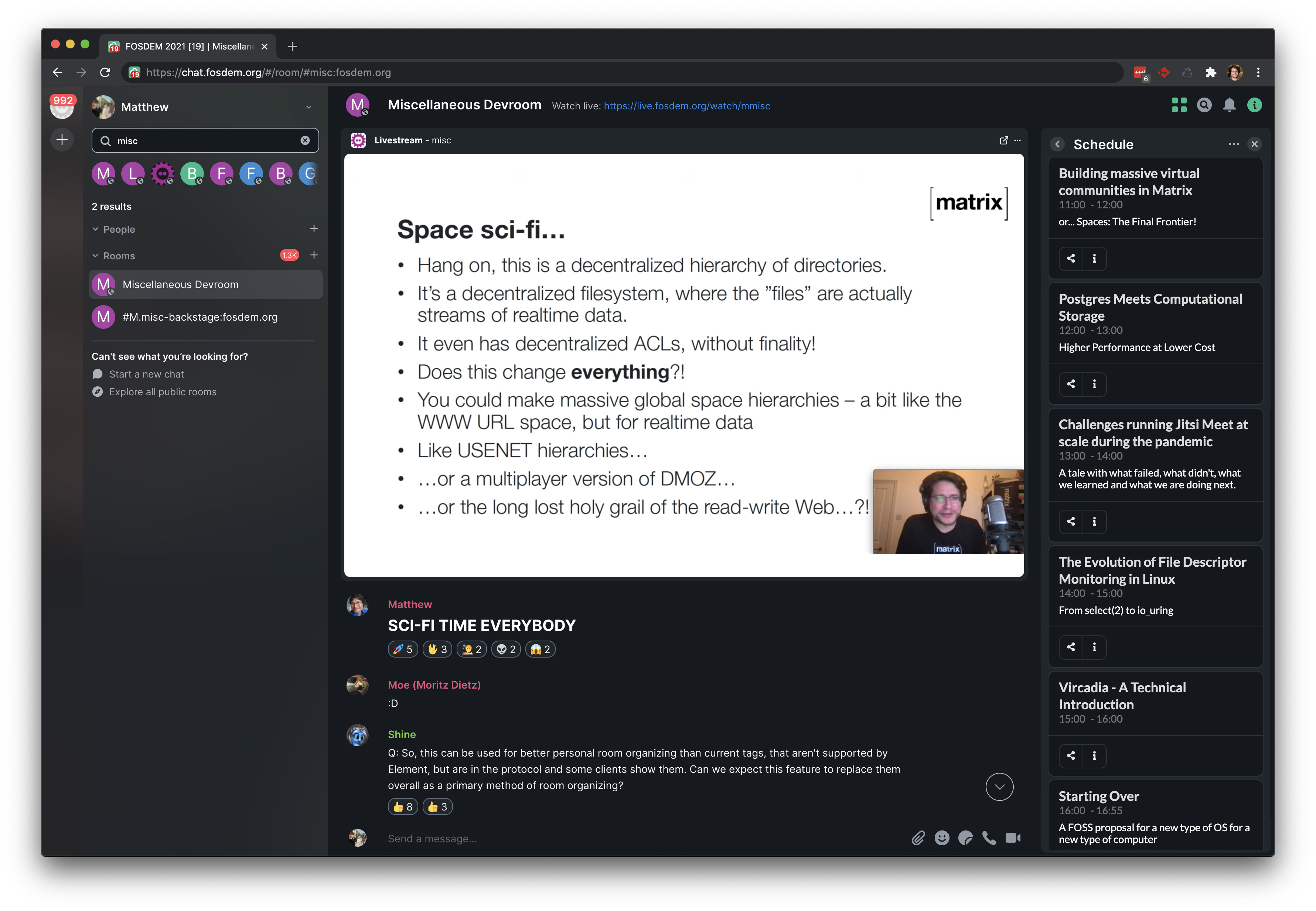 This year, things are of course different. Thankfully FOSDEM 2020 snuck in a few weeks before the COVID-19 pandemic went viral, but for FOSDEM 2021 on Feb 6/7th the conference will inevitably happen online. When this was announced a few months back, we reached out to FOSDEM to see if we could help: we’d just had a lot of fun helping HOPE go online, and meanwhile a lot of the work that’s gone into Matrix and Element in 2020 has been around large-scale community collaboration due to COVID - particularly thanks to all the development driven by Element’s German Education work. Meanwhile, we obviously love FOSDEM and want it to succeed as much as possible online - and we want to attempt to solve the impossible paradox of faithfully capturing the atmosphere and community of an event which is “online communities, but in person!”... but online.
