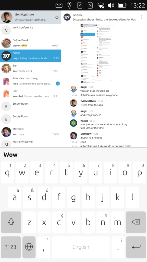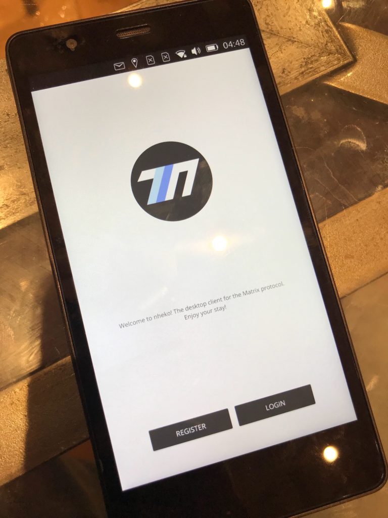 Now the next step here would obviously be to tweak the app properly to layout on a phone (bigger fonts; bigger buttons; resize the window to make room for the OSK; separate the Left Panel from the timeline view; etc) - but the point here was more to show a fully fledged native Matrix client running on a current Linux Phone environment and see how it feels.  And we're happy to say that it leaves us dying to get our hands on a proper Librem5 so we can work with Nheko, uMatriks, libqmatrixclient and all the other native Matrix client projects to see how we can get the best possible native client experience running in PureOS for the phone!!