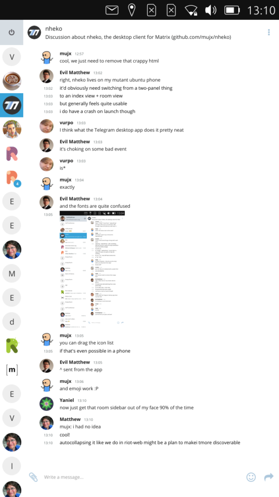 So the core problem of running a client like Nheko on Ubuntu Touch is that it uses lots of fun glossy stuff from Qt 5.9, whereas Ubuntu Touch is still on Qt 5.4, which is over 2 years old now.  Also, it's been written as a desktop client so needs a bit of tuning to support a 'fat-finger' mobile form factor, although this is just a simple matter of programming and is a very similar problem to ensuring the desktop app has a nice responsive design on small screen window sizes (similar to how the telegram desktop client handles it).  In the end, we focused on solving the Qt problem: building a custom Qt 5.9 for Ubports (the community project who do a fantastic job of continuing Ubuntu Touch development since Canonical pulled out), while for simplicity building it on top of the current ubports distribution (which is effectively still Ubuntu 15.04).  The reason for all this Ubuntu stuff rather than using PureOS is simply that it's not far enough along, and we don't physically have a Librem5 dev kit yet to play with!