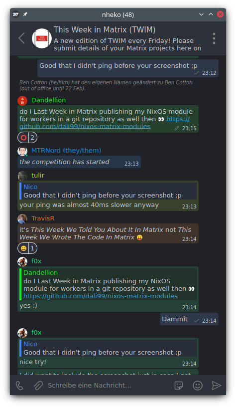 Thanks to the awesome polyjuice client, Nheko now supports MSC3700, which slightly improves privacy in encrypted rooms. It also lead to us fixing issues with the secure symmetric secret storage, where some clients use a different base64 encoding than recommended in the spec, which could make unlocking the secrets with a recovery key or passphrase fail. And we also improved the key queries on initial login, which would sometimes fail to_device messages with a warning, that the device is unknown.